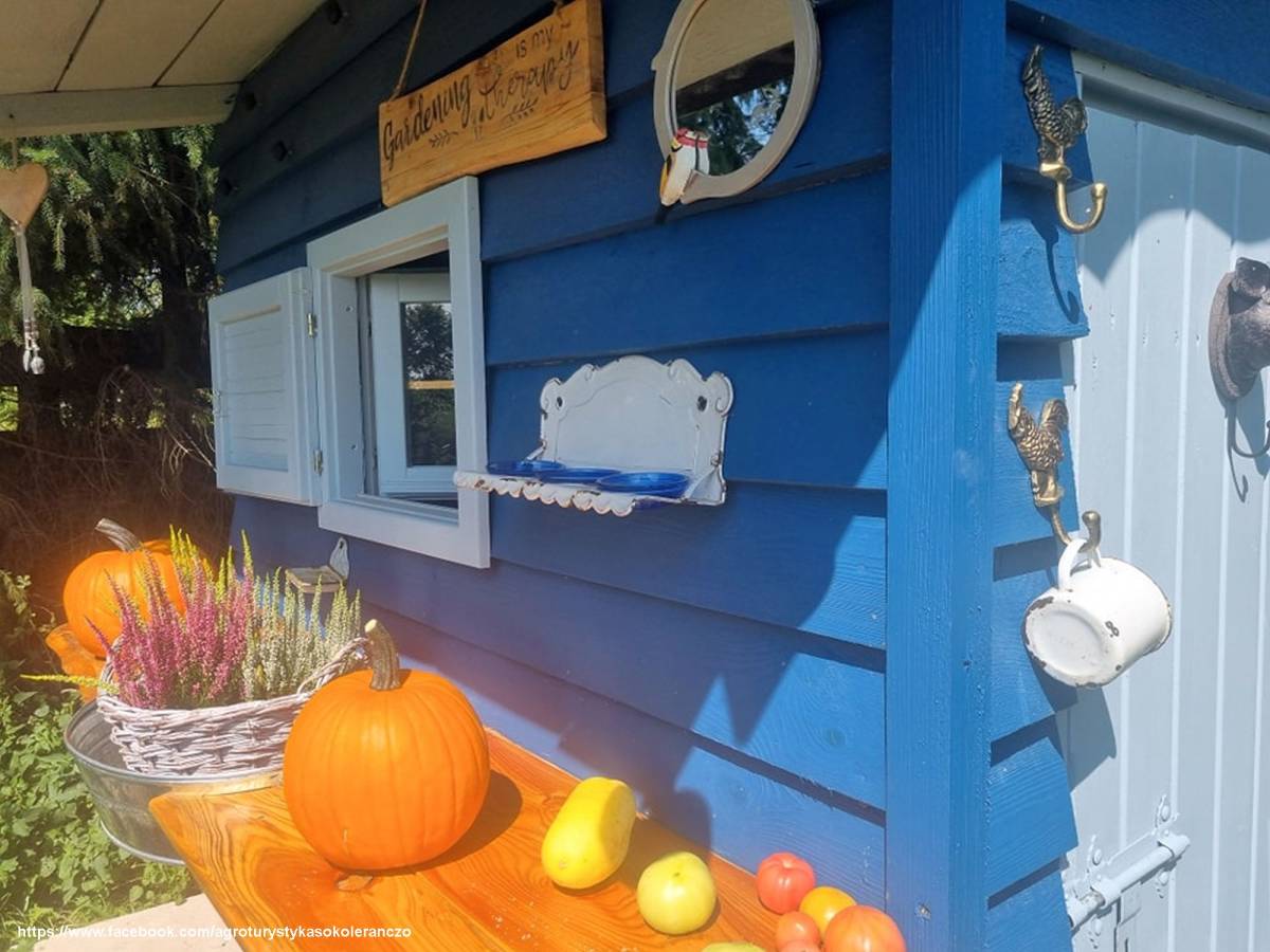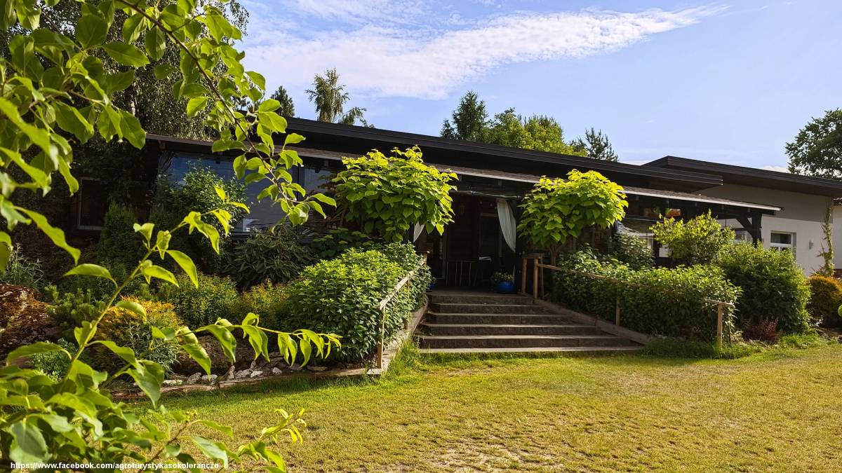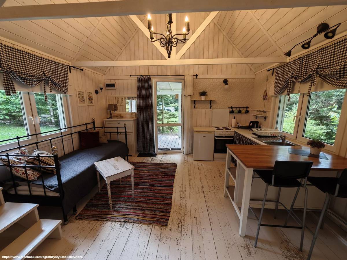 Goście mogą zatrzymać się w apartamentach i domkach o unikalnym wystroju. Duży apartament składa się z trzech pokoi – nadmorskiego, pod kogutkiem i różanego – i oferuje dziewięć miejsc noclegowych. Dla poszukujących prywatności przygotowano apartament słoneczny oraz domki: fiołkową, kasztanową i anielską laubę. Każde z wnętrz zostało urządzone z dbałością o szczegóły, w duchu tradycji i ciepła domowego ogniska. Na terenie gospodarstwa znajduje się także grillowisko, miejsce na ognisko, plac zabaw, parking oraz ekologiczny ogród.
