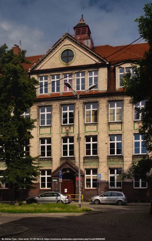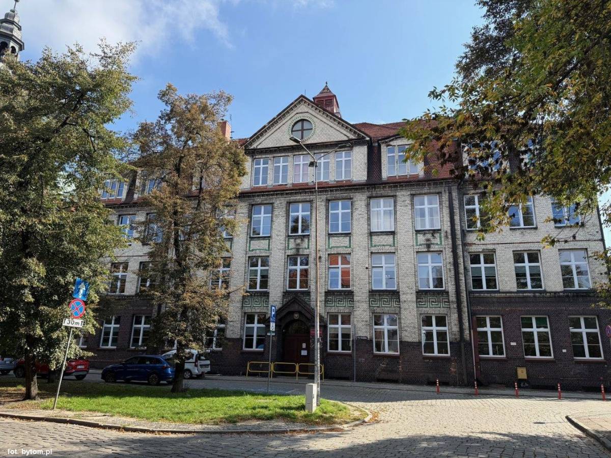 Dawna szkoła ewangelicka w Bytomiu przy pl. Klasztornym 2 powstała według projektu Karla Bruggera z 1908 roku, a ukończona została w 1911 roku. Czterokondygnacyjny budynek o elewacji z białej i czerwonej cegły wyróżnia się mansardowym dachem, ząbkowanym gzymsem i subtelnymi zdobieniami z zielonej cegły. Obiekt nawiązuje do stylu neorenesansowego, charakterystycznego dla wczesnej twórczości Bruggera. Obecnie mieści się tu Poradnia Psychologiczno-Pedagogiczna.